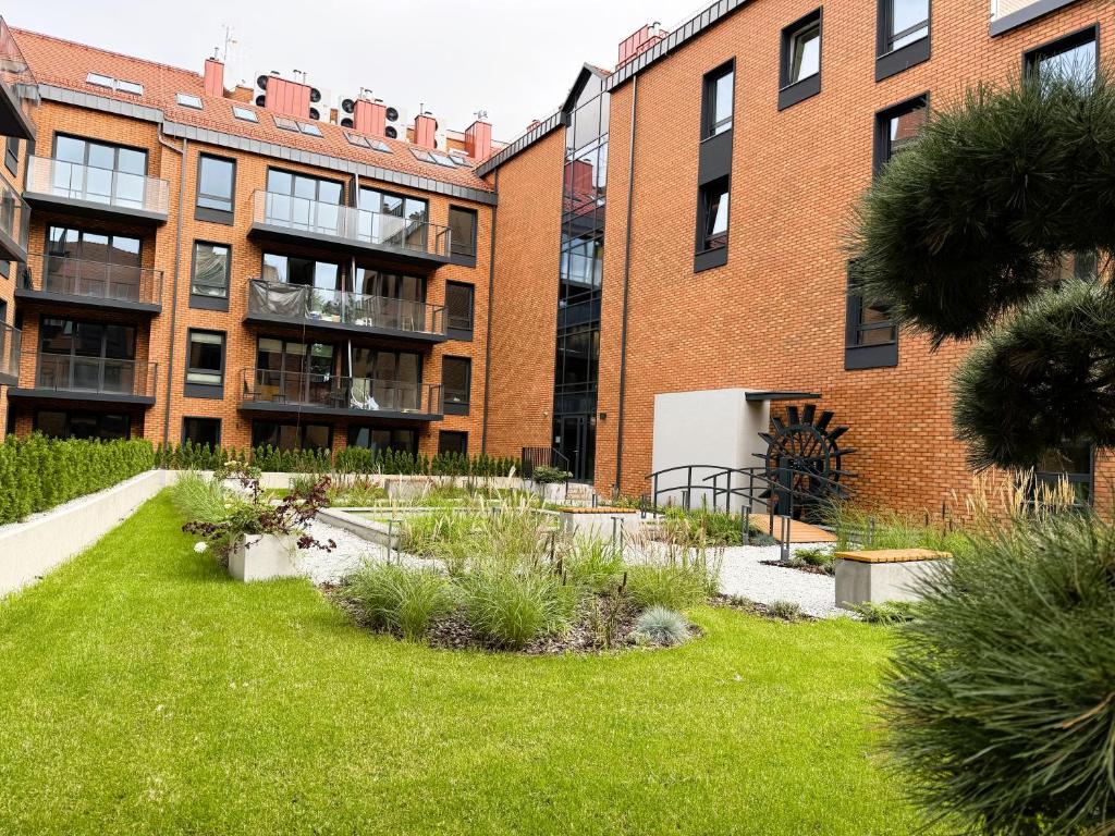 Do dyspozycji Gości przygotowano prywatny dziedziniec z zielenią i zabytkowym młynem wodnym- idealne miejsce na chwilę relaksu w centrum miasta